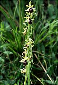 | Beschreibung Die drei bis 6 Grundblätter sind länglich, lanzettlich, der Stengel trägt bis zu 12 Blüten. Die Hüllblätter sind gelbgrün, das mittlere neigt sich nach vorn. Die Lippe ist schwach unterteilt, aber meist höckrig. Auf der Lippe befindet sich eine H-förmige Zeichnung, die hell umrandet ist. |