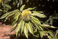 Die Edelkastanie ist ein Tiefwurzler, der über ein ausgedehntes Wurzelsystem verfügt. Sie liebt Wärme und ausreichend Wasser. Bodenansprüche dagegen hat sie keine besonderen. Sie gehört zu den laubabwerfenden Bäumen. Ihre Blätter sind länglich- lanzettlich, meist stark gezähnt. Die Fruchtkapseln haben viele eng aneinandersitzende Stacheln. Sind die Maronen in der Kapsel reif, platzt die Kapsel sternförmig in vier Teile auf und entläßt den Samen. Aufgrund ihres Multitalents ( Mehl, Gemüse, Holz, Gerbstoffe ) und ihre Standhaftigkeit und Wärmeliebe hat die Esskastanie viele Freunde gefunden, die den Bestand auch in den Mischwäldern Mitteleuropas erweitern möchten. |